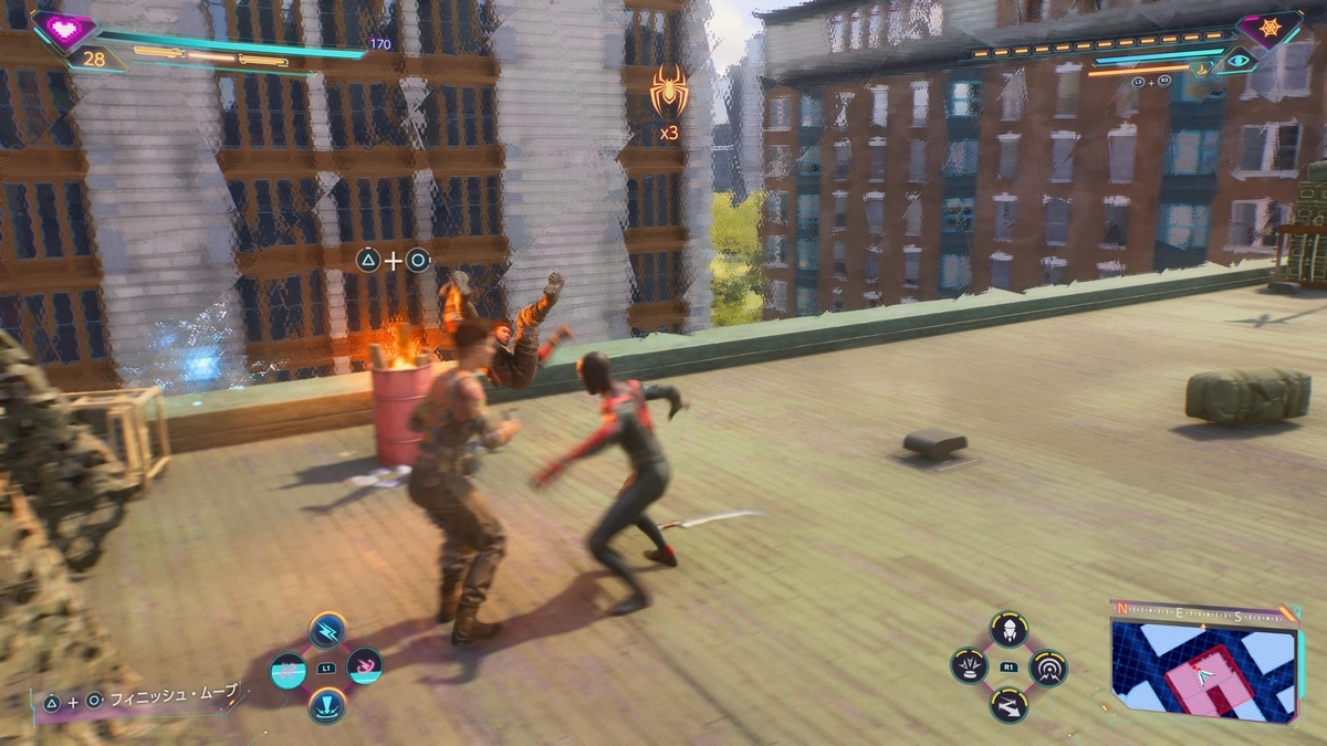 戦闘は基本的には敵に対して通常攻撃をしかけつつ、ウェブを使って動きを止める、敵を引っ張る、ガジェットを使った追加攻撃や行動制限、アビリティを使った高ダメージ攻撃や範囲攻撃を繰り出すことで敵を倒すのが基本的な流れになります。色々書きましたが操作は簡単で、基本的にはボタンを連打しておけばOK。ただ、タイミングよく回避したりパリィをする必要もあるので、そちらに意識を割く必要があるタイプですね。